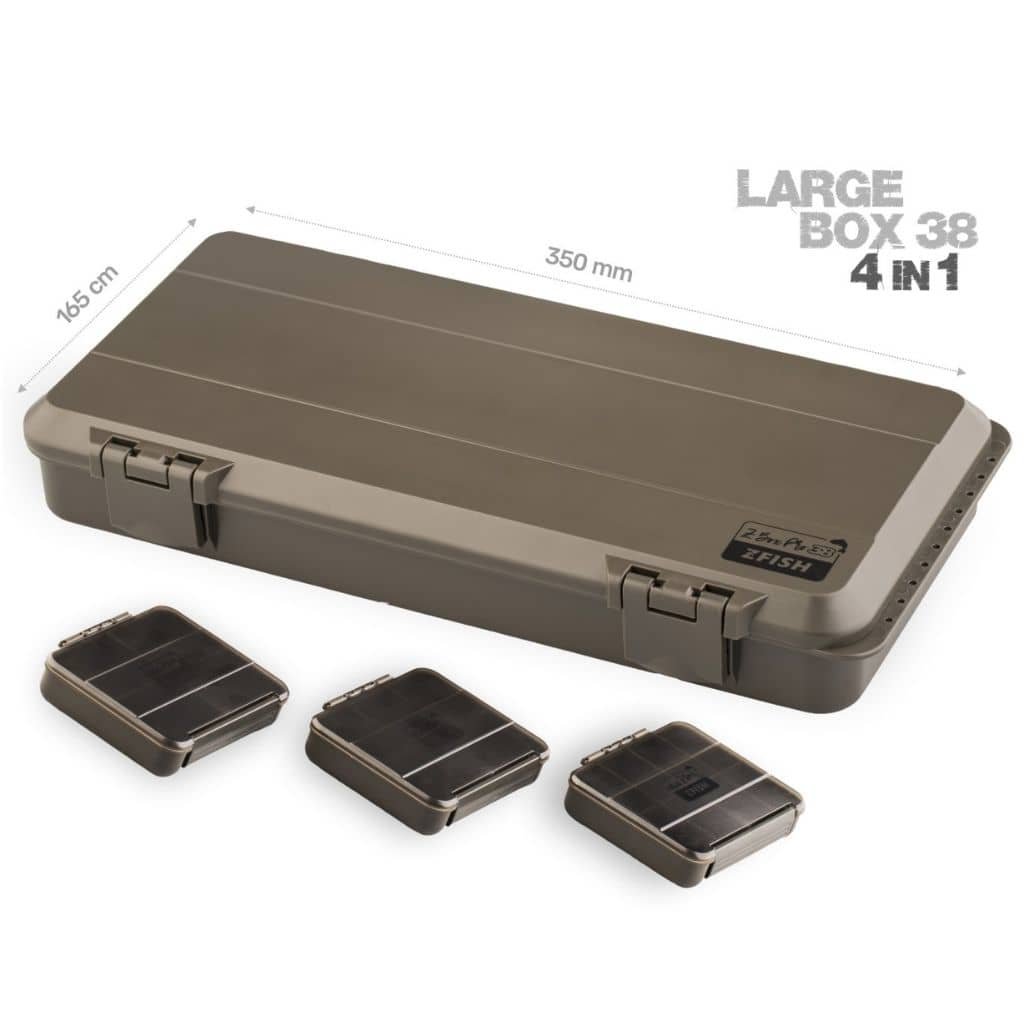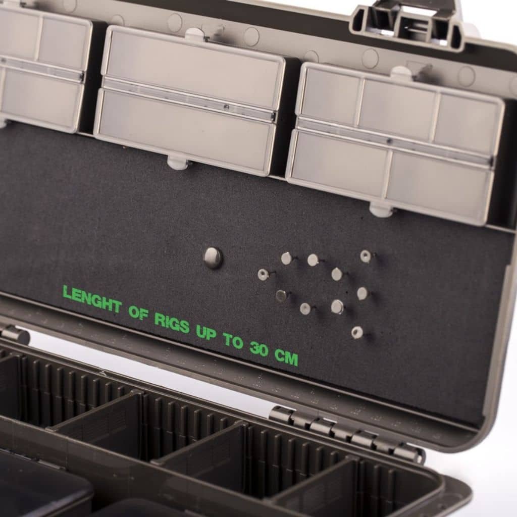 Veľkou výhodou je aj prakticky riešené veko, ktoré obsahuje uzatvárateľné priehradky a zároveň kompletný zásobník na náväzce. Ten je vybavený hrazdou pre háčiky, penovou časťou s rozmermi 270 × 80 mm, desiatimi aretačnými špendlíkmi a integrovaným pravítkom, ktoré ocení každý rybár pri viazaní náväzcov.